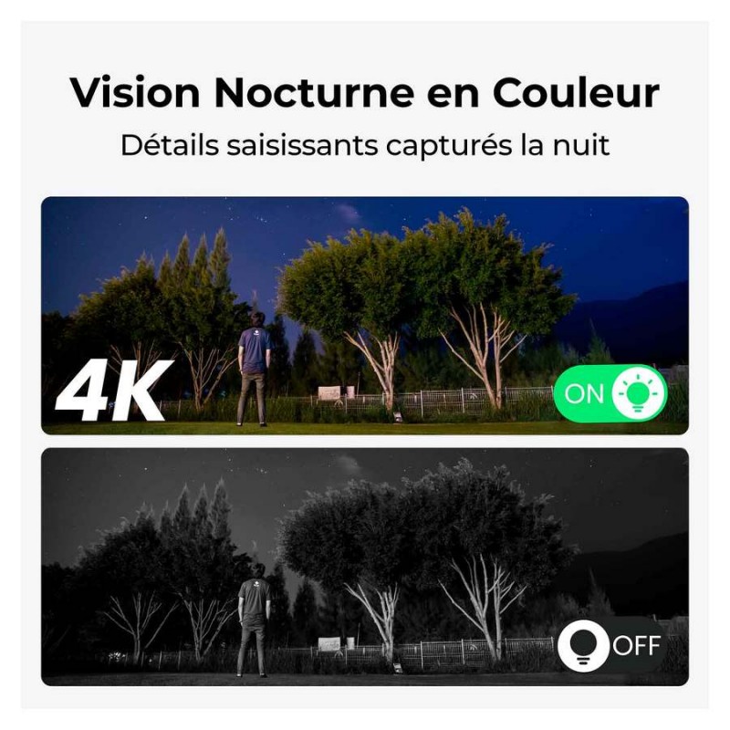 La caméra fournit des images HD 4K 8MP détaillées 24 heures sur 24. La nuit, allumez le projecteur pour une vision nocturne en couleur ou éteignez-le pour une vision nocturne en noir et blanc.